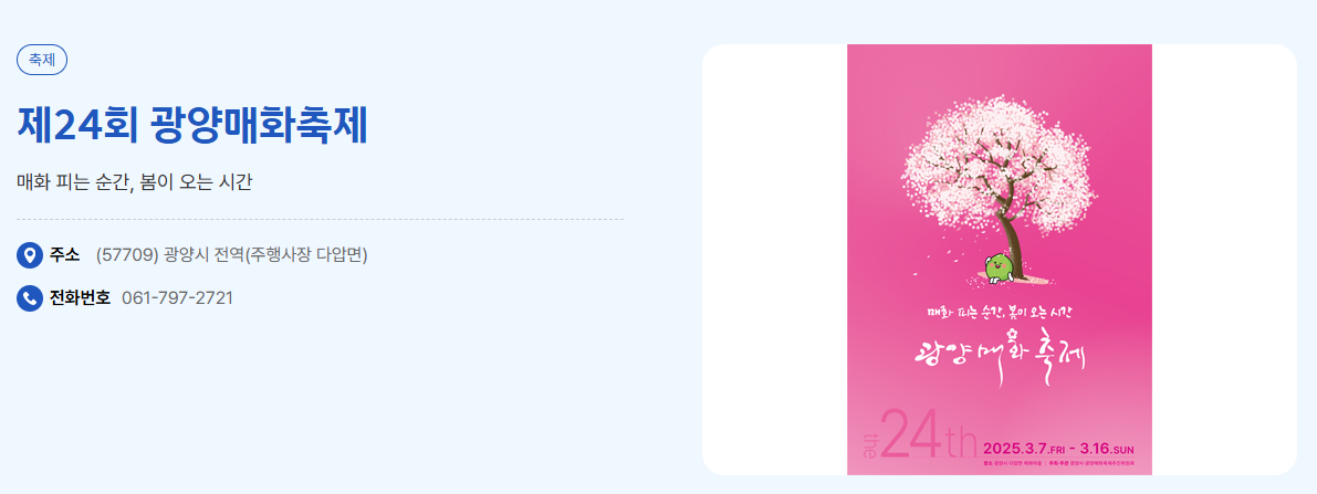 광양 매화축제는 매년 국내 최대 규모의 꽃 축제로, 백운산 자락 섬진강변 매화마을을 중심으로 열립니다. 2025년 제24회 광양매화축제는 3월 7일부터 3월 16일까지 10일간 개최될 예정입니다.