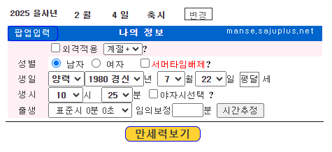 사주풀이 도우미 사이트에서는 생년월일을 입력하면 간편하게 만세력을 확인할 수 있습니다. 기본적으로 생년월일만 입력한 후 ‘만세력 보기’를 누르면 결과가 출력됩니다.