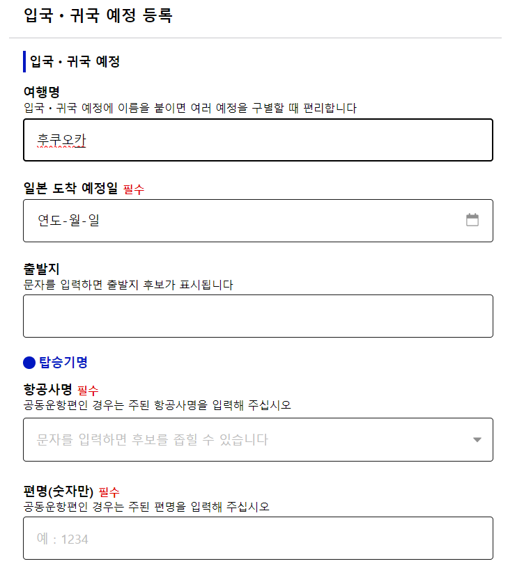 - 예를 들어, 나리타 공항이면 "Narita", 간사이 공항이면 "Kansai"라고 기재합니다.