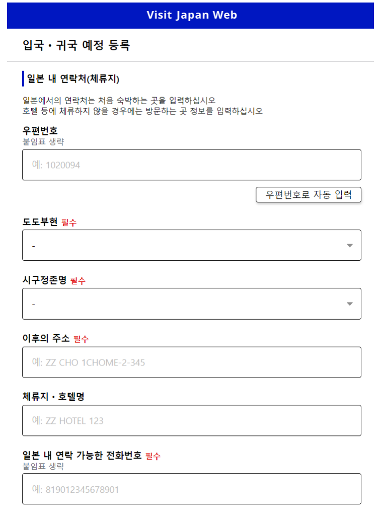 - 일본 체류 주소(Address in Japan): 숙소의 이름과 주소를 적습니다.