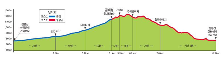 다른 코스는 하산용으로 이용되는 코스도 있으며, 주목군락지와 철쭉군락지 등을 볼 수 있는 구간도 있습니다. 이 코스는 오르막과 내리막이 반복되므로 조금 더 체력적인 부담이 있을 수 있습니다. 안전을 위해 하산 전용 코스를 이용하는 것이 좋습니다.