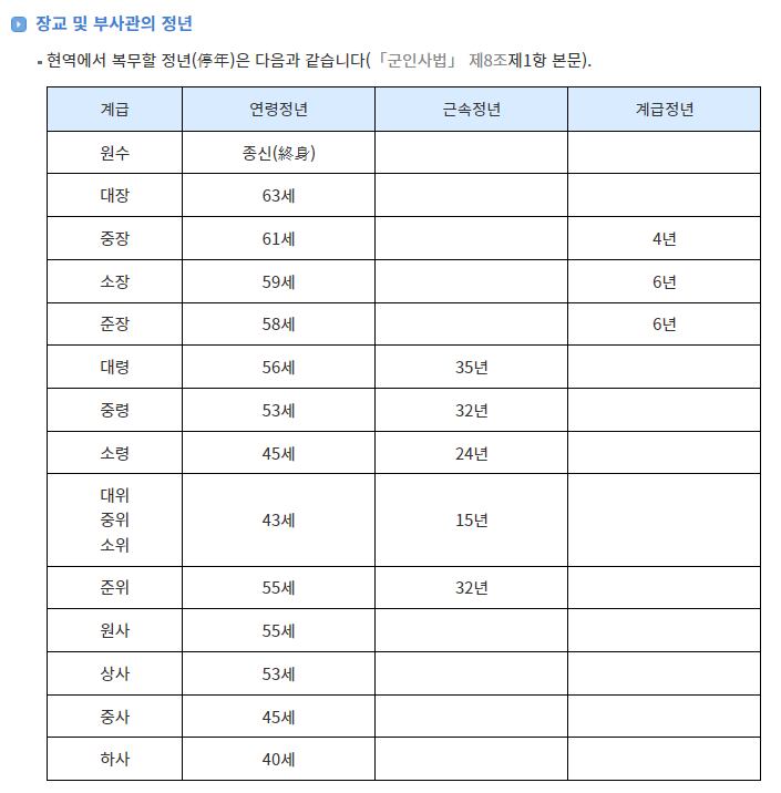 군인의 경우 계급에 따라 정년이 달라집니다. 만약 일정 정년나이 이전에 해당 계급에 올라가지 못할 경우 정년을 맞게 되는 것 이기 때문입니다.