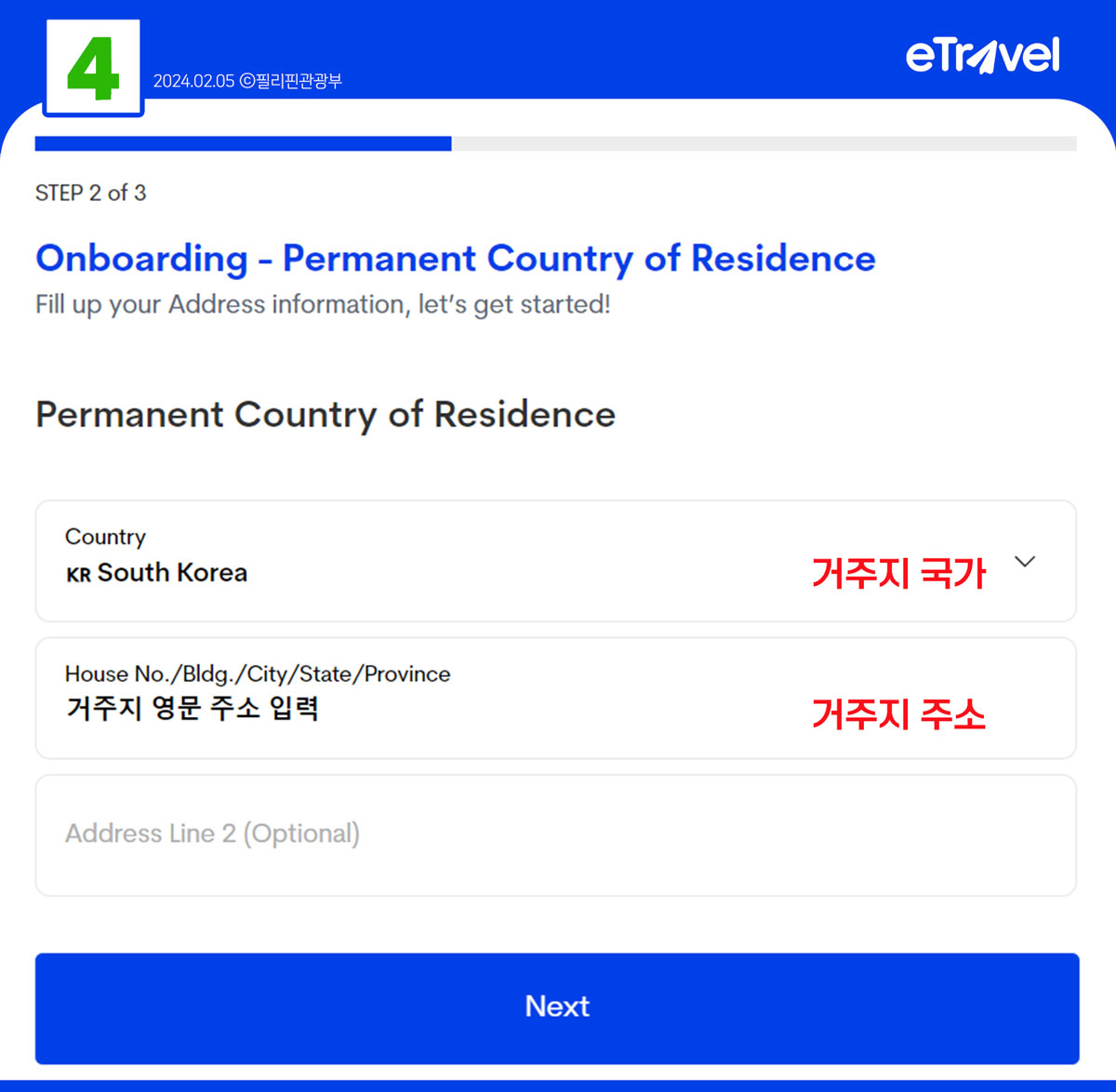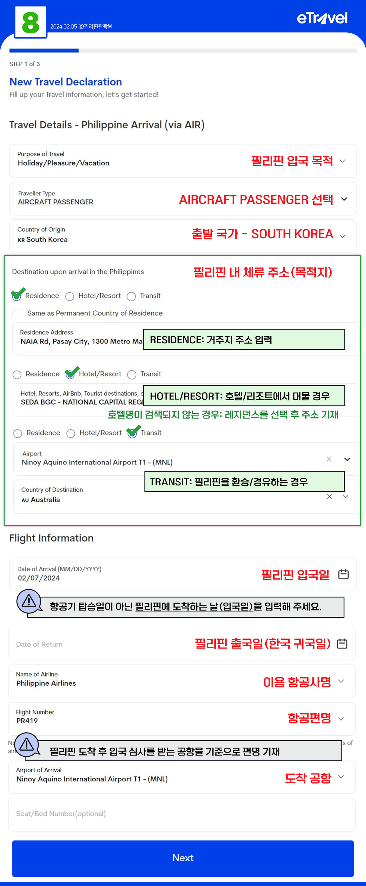 필리핀으로 가는 항공편과 숙소 정보를 입력하는 단계입니다. 항공편 번호, 출발 공항, 도착 공항, 그리고 필리핀에서 머무를 장소를 적어주세요. 정확한 정보가 필요하니, 예약 확인서를 참고하는 것이 좋습니다.