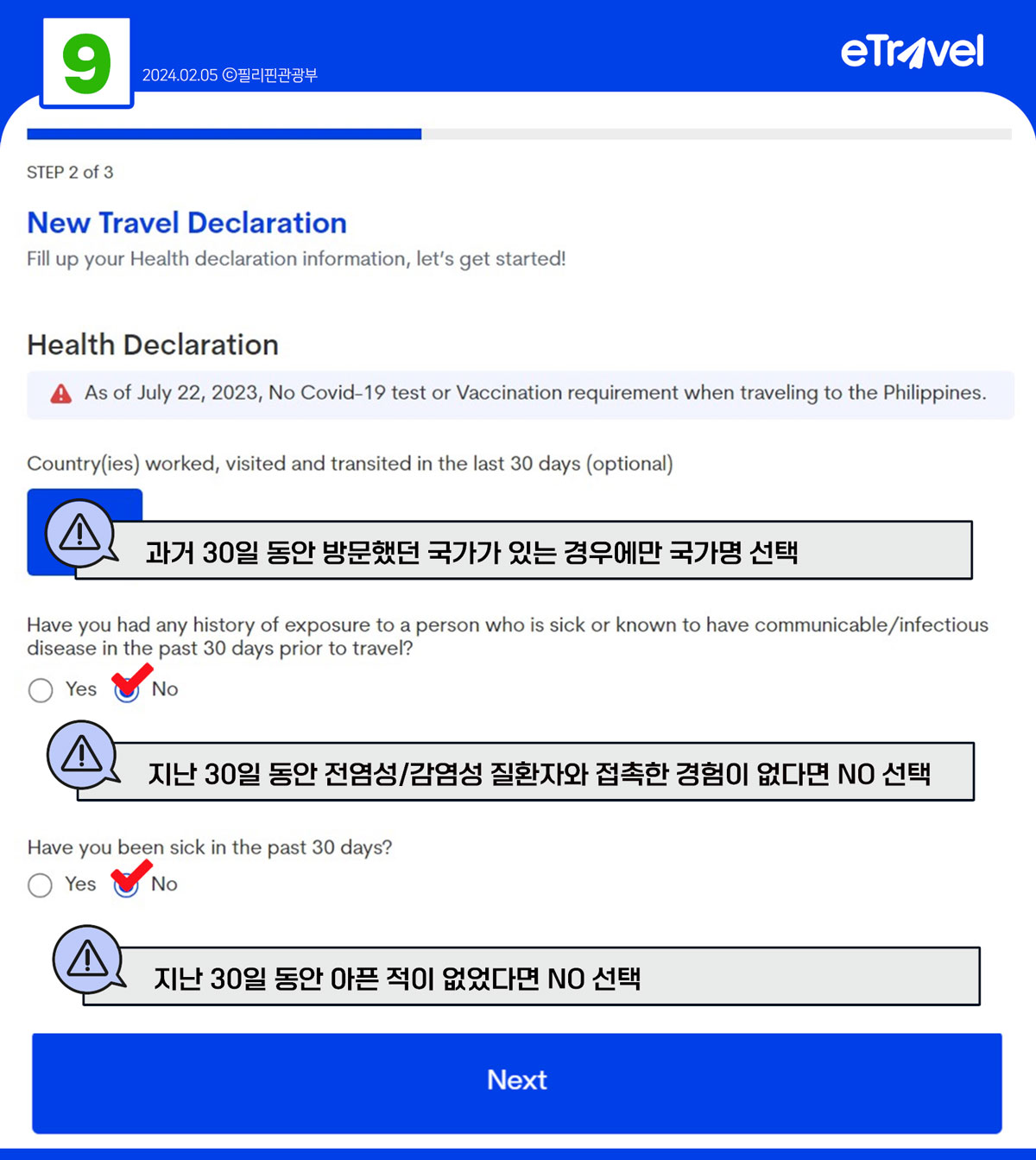 건강 상태 및 여행 이력 입력