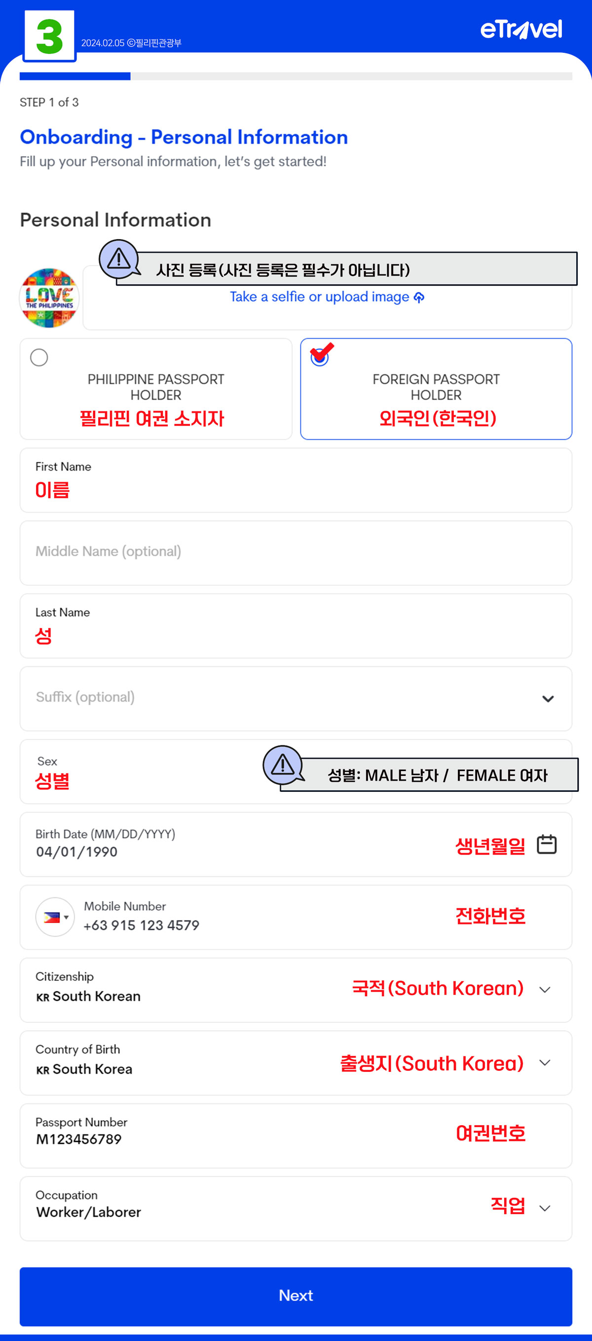 첫 번째 단계는 본인의 기본적인 개인 정보를 입력하는 것입니다. 여권 번호, 성명, 생년월일, 성별 등 여권과 일치하는 정보를 정확히 입력해야 합니다.