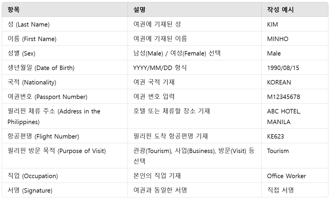 필리핀 입국신고서 작성 항목 (Arrival Card 기입 정보)은 다음과 같습니다.