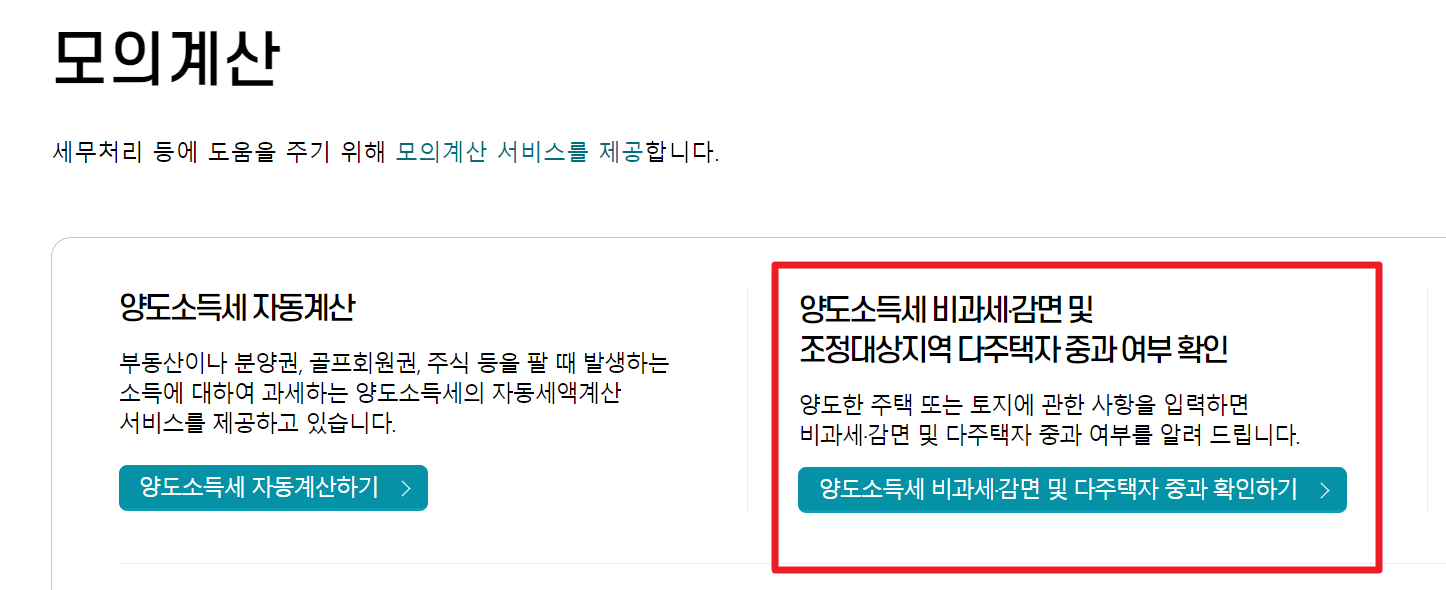 - 홈택스 > 세금모의계산 > 양도소득세 > 비과세 자가진단을 선택합니다.