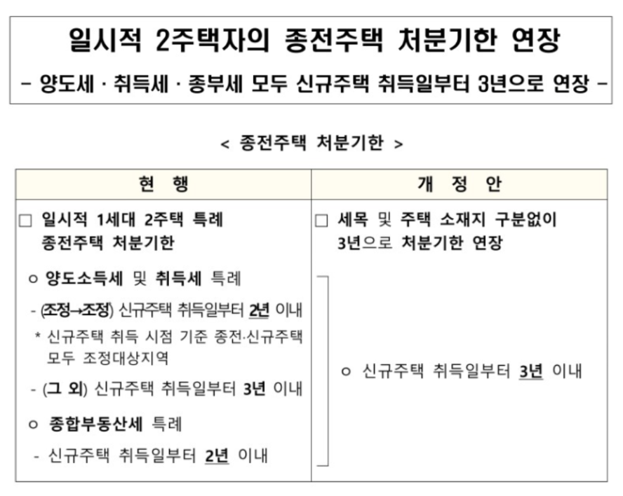 새로 주택을 취득한 후 기존 주택을 3년 이내에 매각해야 합니다. 이는 기존의 2년에서 3년으로 연장된 사항으로, 부동산 거래가 활발하지 않은 지역에서도 혜택을 받을 수 있도록 개정되었습니다.