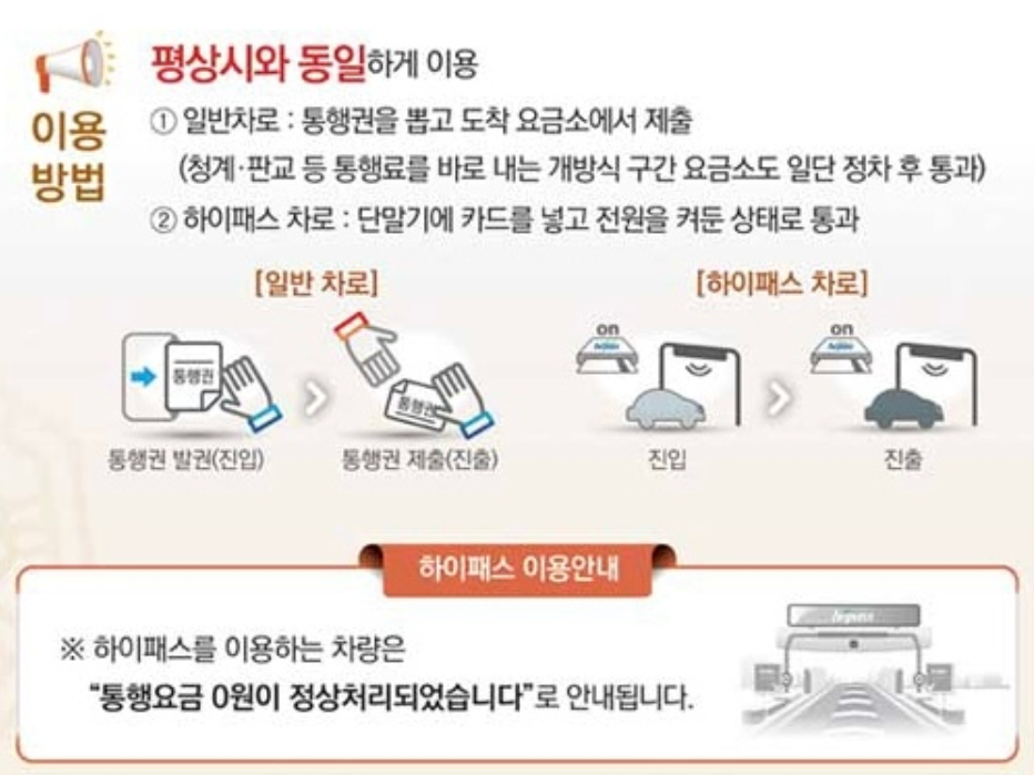 면제기간 동안 고속도로를 이용하는 모든 차량은 통행료를 지불하지 않아도 됩니다. 이 기간 동안 고속도로를 이용하는 차량이 많아짐에 따라 도로는 평소보다 혼잡할 수 있습니다.