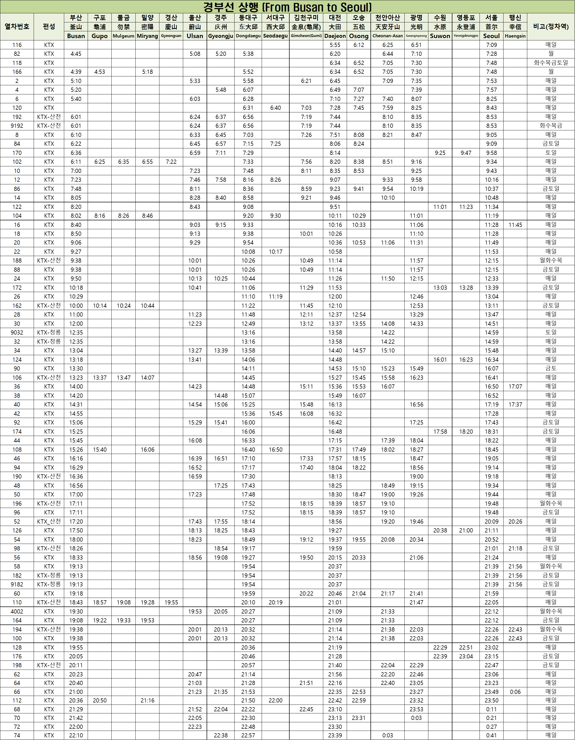 이 경부선 시간표는 코레일 홈페이지를 통해 정기적으로 업데이트 됩니다. 지금은 최신 경부선 시간표로 업데이트 된 시간대에 열차가 운영되고 있어 한 눈에 보기가 매우 쉽고 편리합니다.