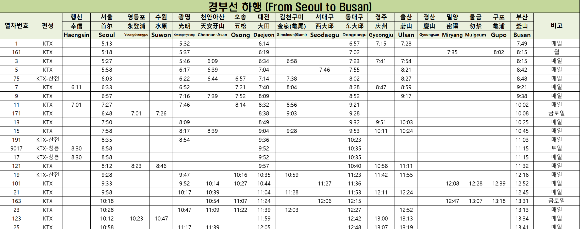 KTX 경부선 시간표는 서울에서 부산까지 빠르고 편리하게 연결해 주는 중요한 정보입니다. 상행선과 하행선 시간표를 미리 확인하고, 코레일 홈페이지나 모바일 앱을 통해 예매를 하면 더욱 효율적으로 KTX를 이용할 수 있습니다. 시간표를 잘 활용하여 빠르고 편리한 여행을 즐기시기 바랍니다.